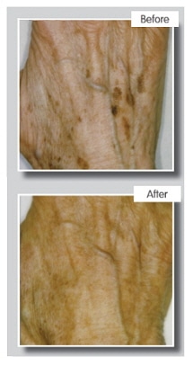IPL or Intense Pulse Light skin rejuvenation and pigment removal treatment is a relatively quick and easy procedure. Age spots and freckles can be lightened or removed in as little as one to three treatment sessions. The light targets areas of excess pigment safely breaking down the excess melanin. The sun spots or freckles darken in the first few days after treatment and then the excess melanin sheds naturally away.